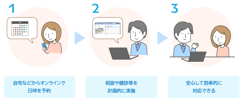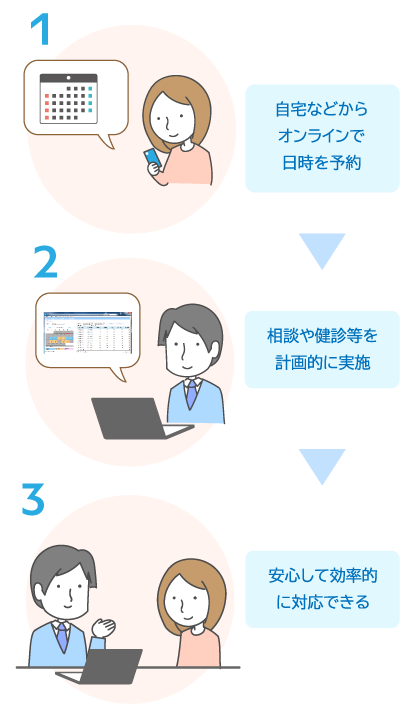 汎用オンライン予約サービスでは、オンライン予約により相談や健診等の計画的な対応をご支援します。住民はスマートフォン等のガイドに沿って訪問日時を予約。計画的に業務を進めることができ、業務効率化を実現可能です。